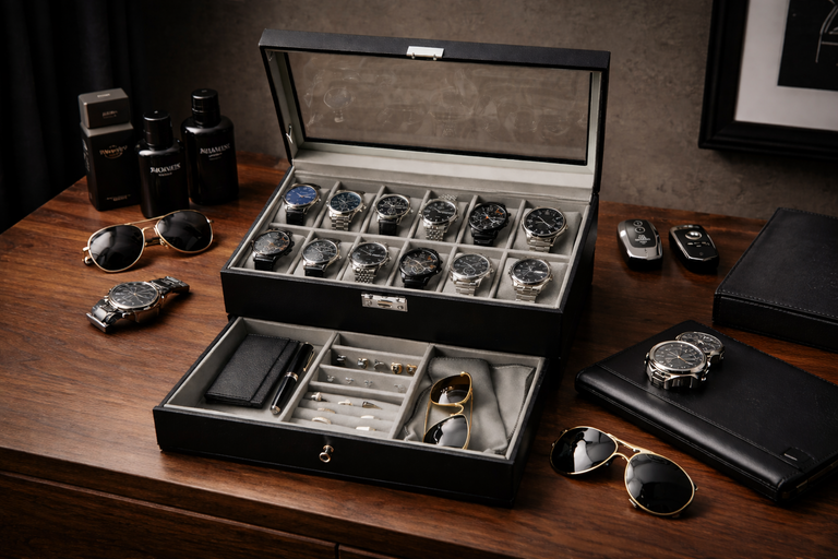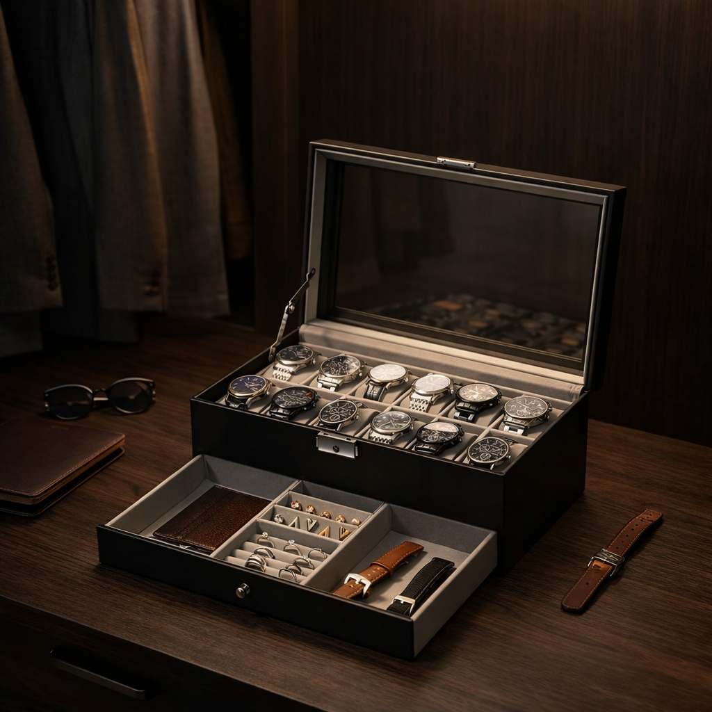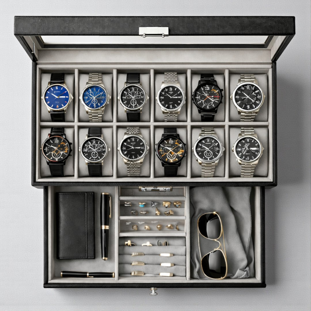 Un cofanetto nero pensato per chi ama ordine e praticità: 12 posti per orologi, coperchio in vetro per vedere subito la collezione, chiusura con fibbia in metallo e un cassetto inferiore per riporre gli accessori, tutto in un unico spazio pulito ed elegante.
