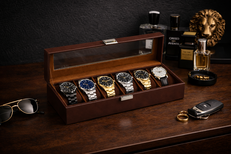 Un cofanetto color espresso pensato per chi ama ordine e praticità: 6 posti per orologi, coperchio in vetro per vedere subito la collezione e chiusura con fibbia in metallo — tutto in uno spazio pulito, elegante e facile da usare.